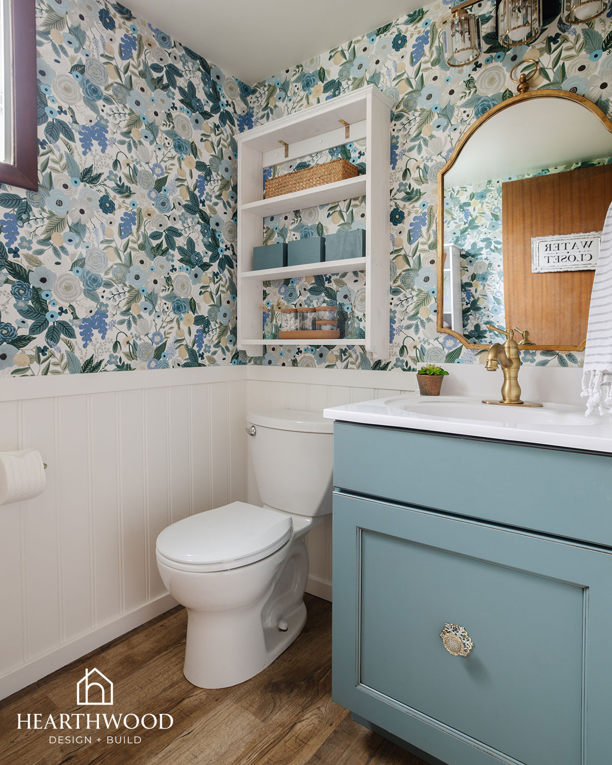 Now, this once-dated bathroom feels intentional and warm. The combination of warm blue, crisp white, and the statement wallpaper makes the space feel fresh but timeless. It flows beautifully with the rest of the home, and serves as a perfect example of how a few thoughtful changes can go a long way.