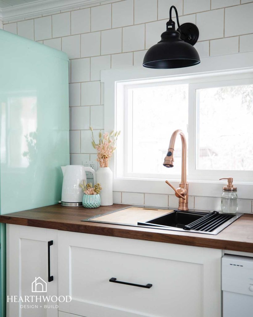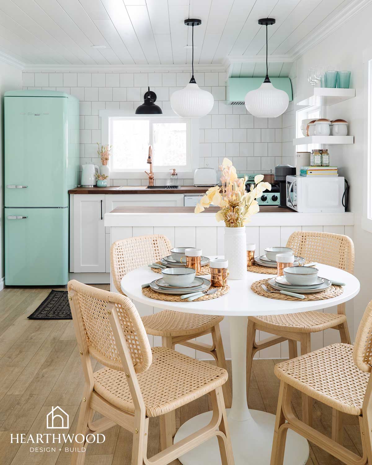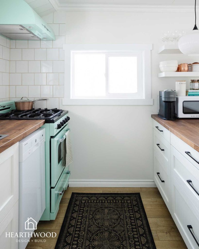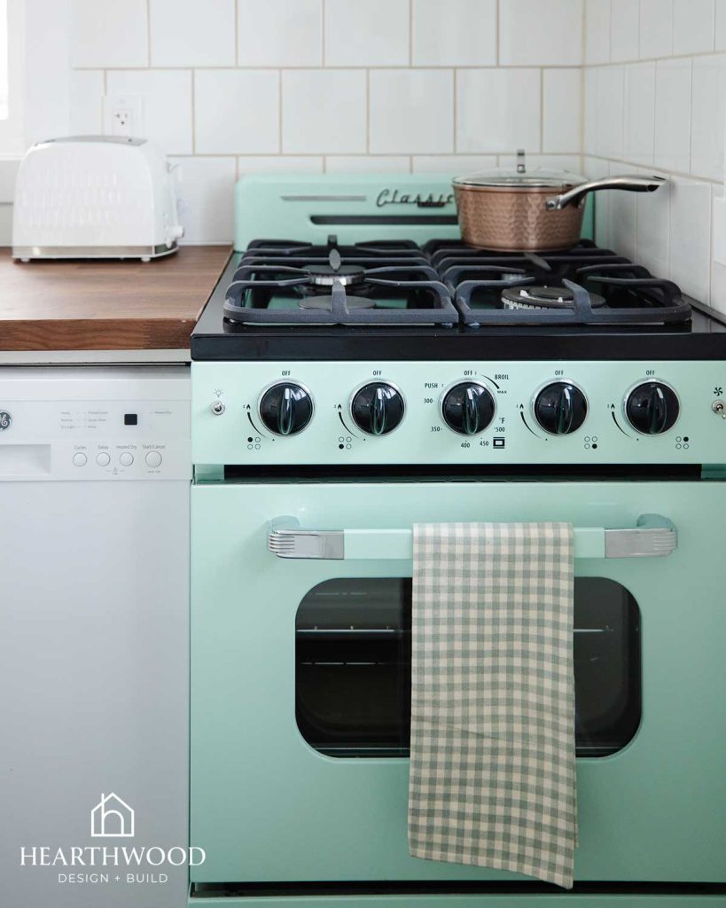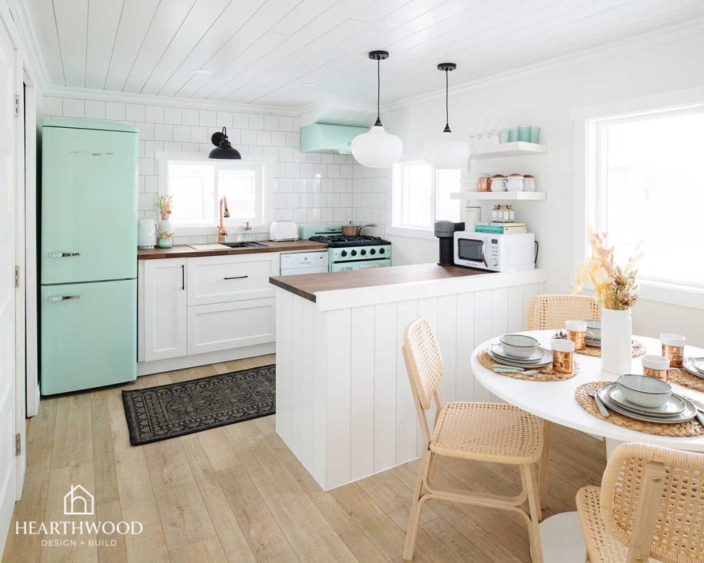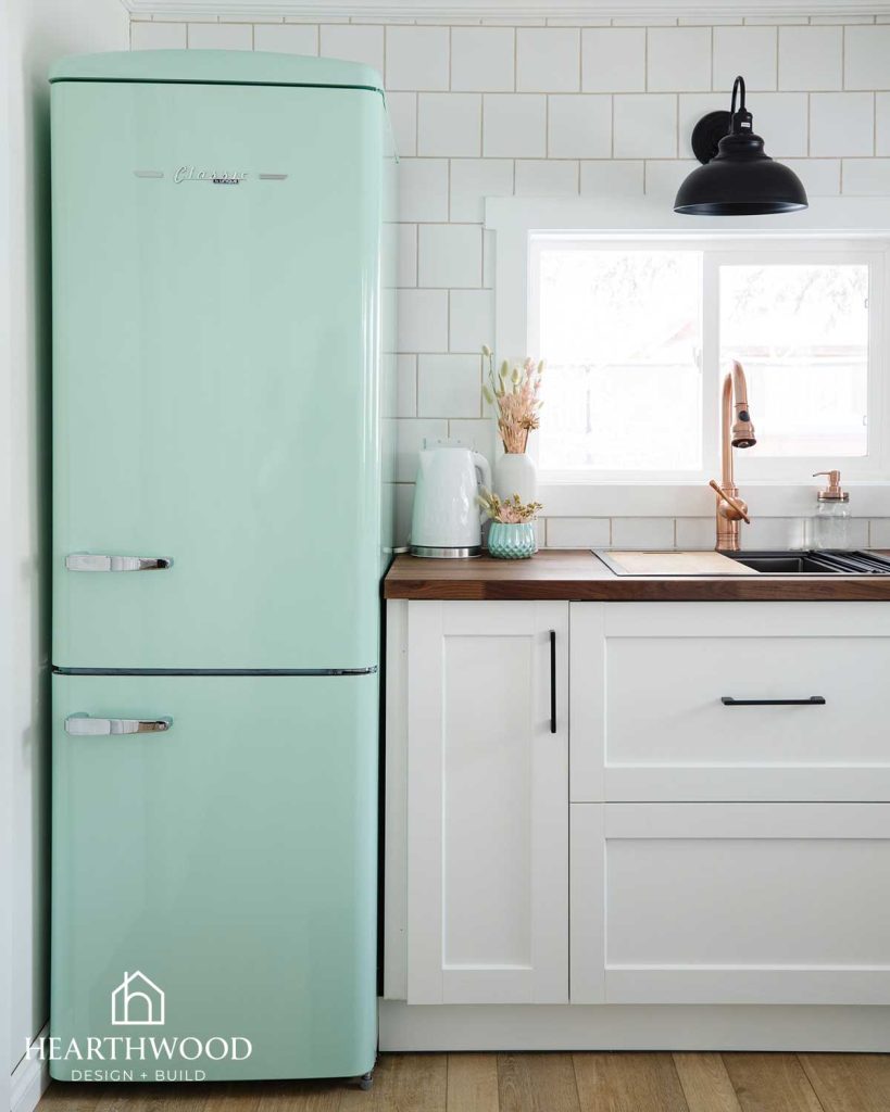 Mint green vintage-inspired appliances create a playful focal point that immediately brings charm to the kitchen. To ground the space, we paired them with warm wood butcher block countertops that add natural texture and cozy cabin warmth.