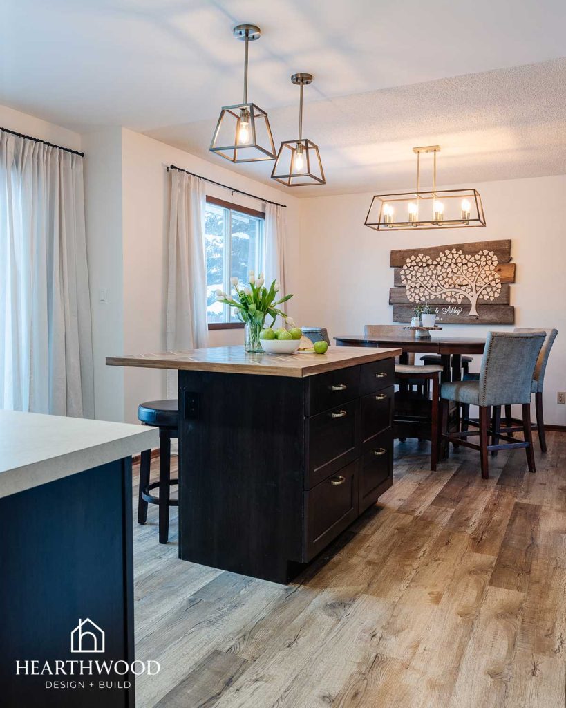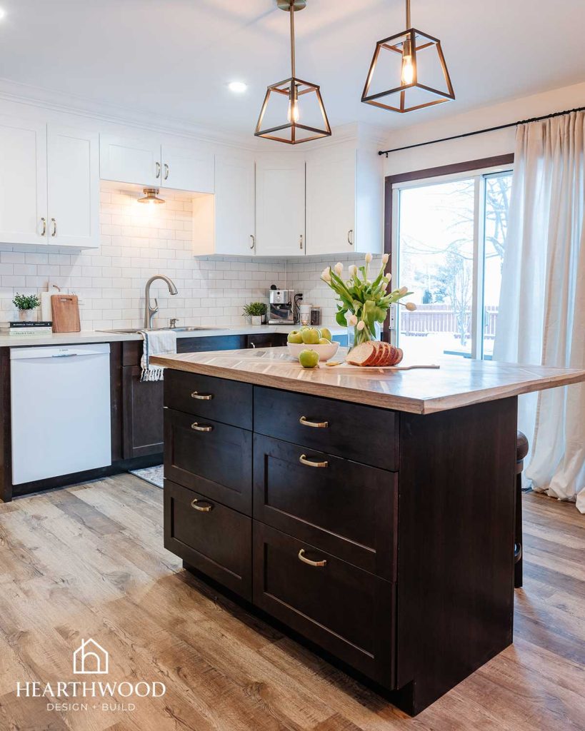 Our clients loved the idea of darker cabinetry on the bottom (hides dirt) paired with lighter uppers for a bright, open feel. To blend traditional and modern, we selected Shaker-style cabinets, warm gold hardware, and a timeless white subway tile backsplash. Opening the space was also a must, so we removed the dividing wall between the kitchen and dining room to create a more connected main floor.