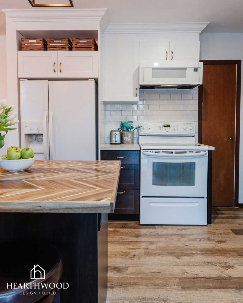 The perimeter features a light Formica laminate countertop: durable, affordable, and easy to maintain. On the island, a butcher block top brings warmth and a natural texture that balances the modern finishes.